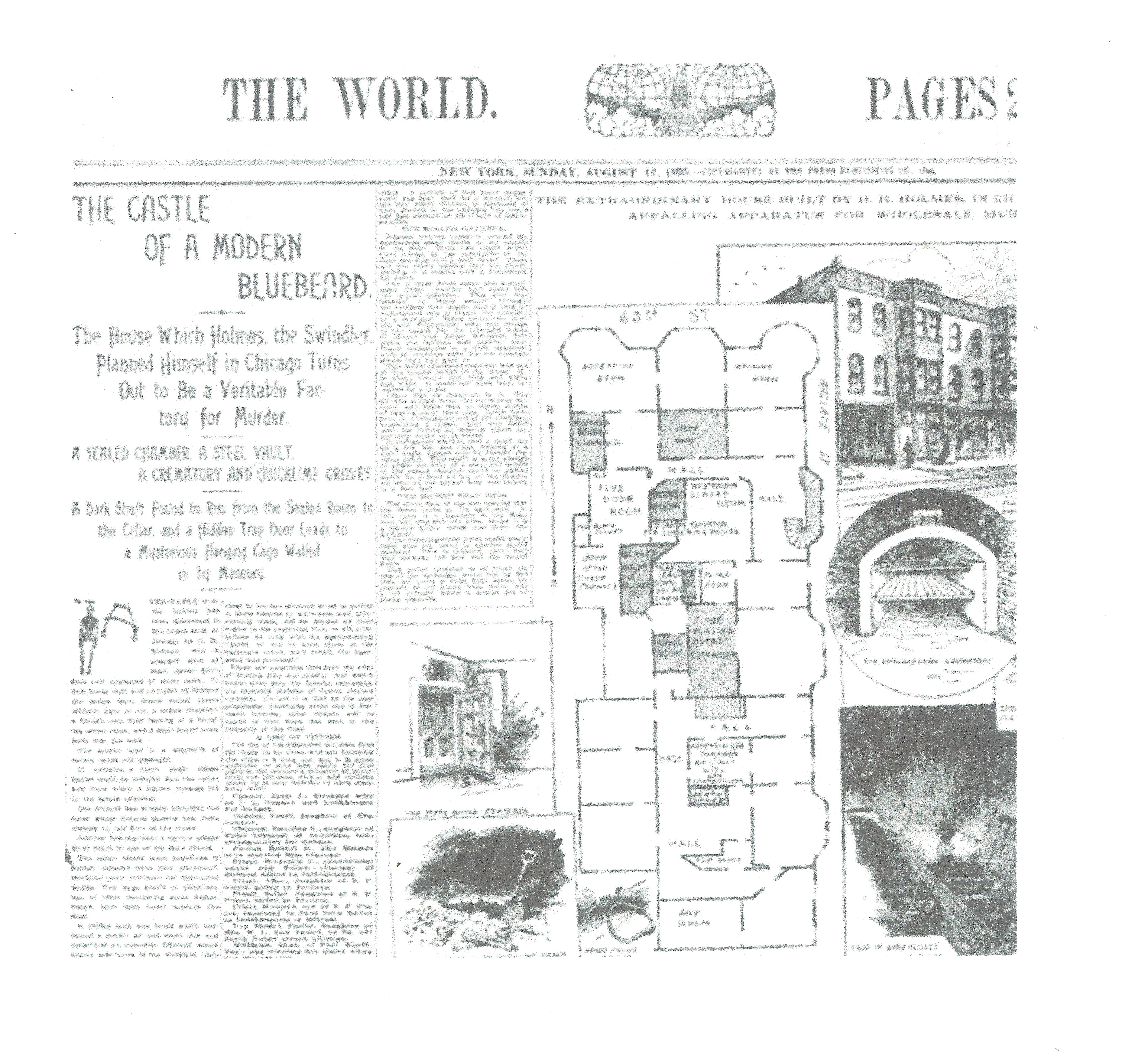 On August 11, 1895, Joseph Pulitzer’s The World published a fictional floor plan of Holmes’ “Murder Castle” with (left to right and top to bottom): a vault, a crematorium, a trapdoor in the floor, and a quicklime grave with bones.