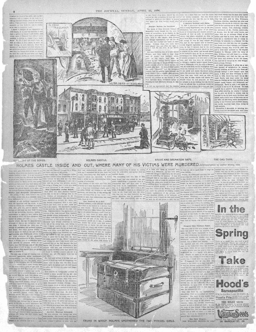 The April 12, 1896, edition of New York Journal, showing the exterior and interior of Holmes’ “Castle”; the bottom picture is the trunk he used in the murder of the Pitezel sisters.