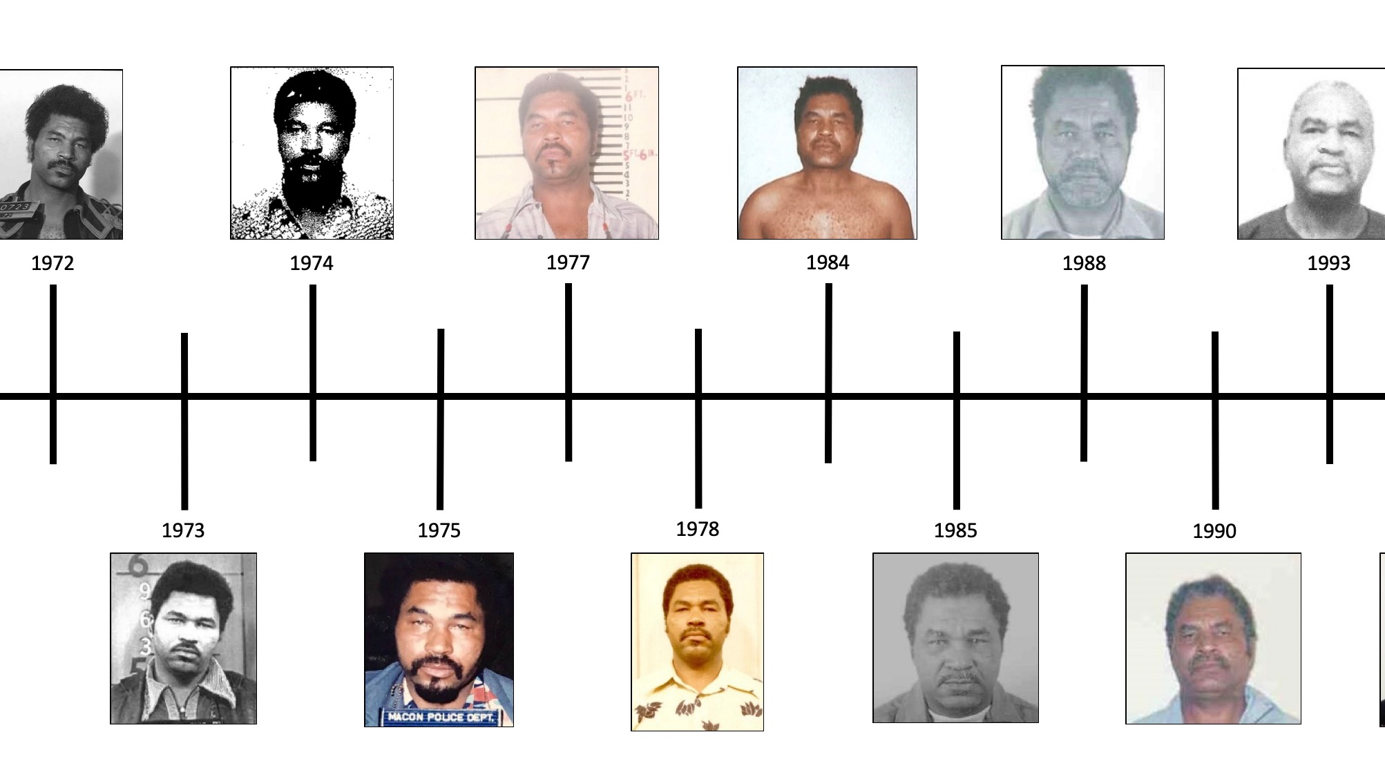 Years of mugshots taken of serial killer Samuel Little from 1966 to 1995. Photo courtesy of the FBI. Public domain.